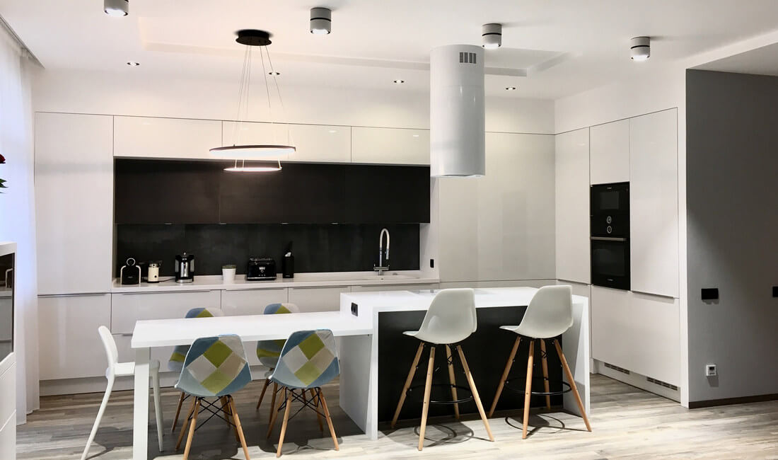 Если при планировке гарнитура вы рассчитываете обойтись барной стойкой и не приобретать обеденный стол, то наиболее разумным может стать решение об увеличении ее ширины. Например, со стандартных 55 сантиметров до 70. А оценить такой необычный вариант визуально поможет 3D-модель проекта.