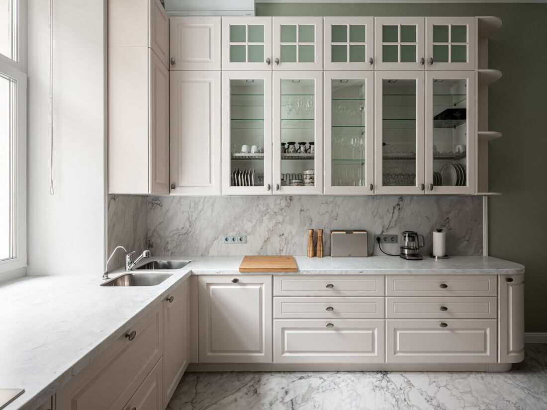 Совет: По возможности максимально разгрузите столешницу, убрав все необходимое в шкафы или подняв на фартук. Для этого в современных интерьерах используется система рейлингов или дополнительных полок.