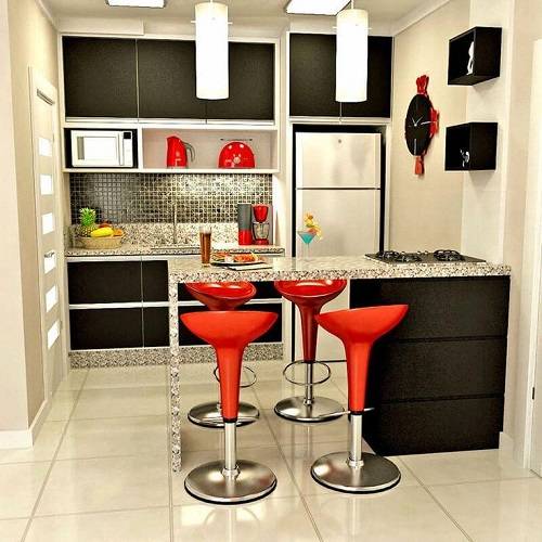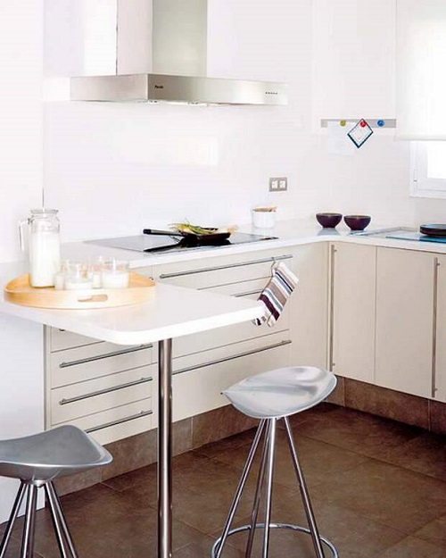 Это очень удобный вариант для маленькой кухни, так как отличается небольшими размерами. По высоте мини-стойка соотносится с размерами обычного обеденного стола — 75—85 см. При этом она достаточно короткая — 60—90 см, а высота сидений стульев от пола не должна превышать 60 см.