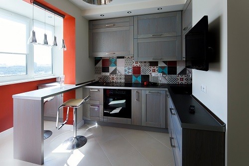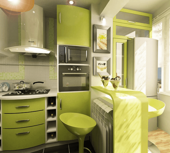 В случае объединения кухни и балкона остается простенок, возле которого будет уместно расположить барную стойку. Она не должна быть большой, чтобы не загромождать пространство и позволять свободно перемещаться между кухней и балконом. Этот вариант будет выглядеть очень интересно и оригинально.