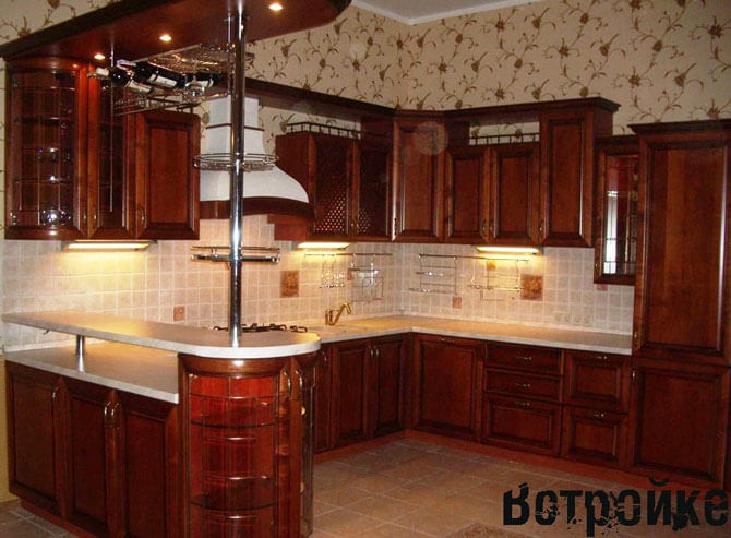 Высокая стойка (1,1-1,3 м) подойдет для больших помещений. В компактных кухнях с низким потолком дизайнеры рекомендуют использовать модели до 90 см. Для квартиры-студии монтируют конструкции средних параметров (в пределах 1 м).