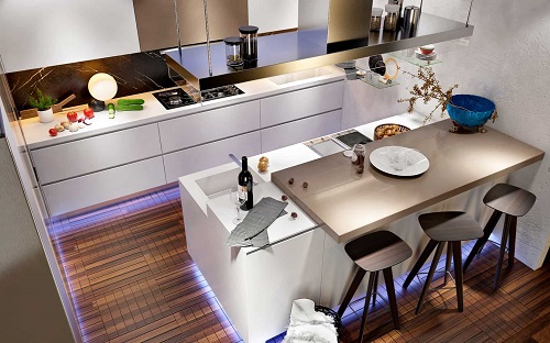 Возможны и разноуровневые стойки, когда одна ее часть равна по высоте кухонной столешнице, а другая выше и играет роль стола в компании высоких барных стульев.