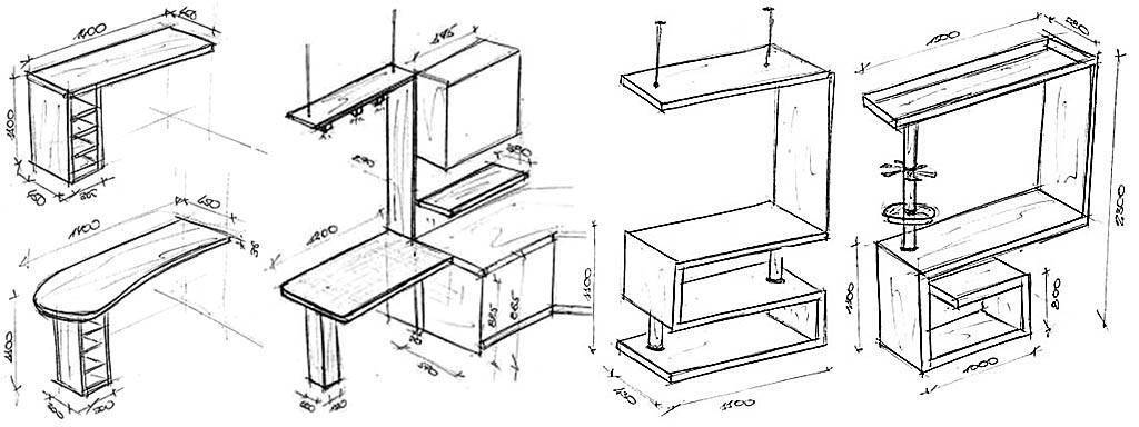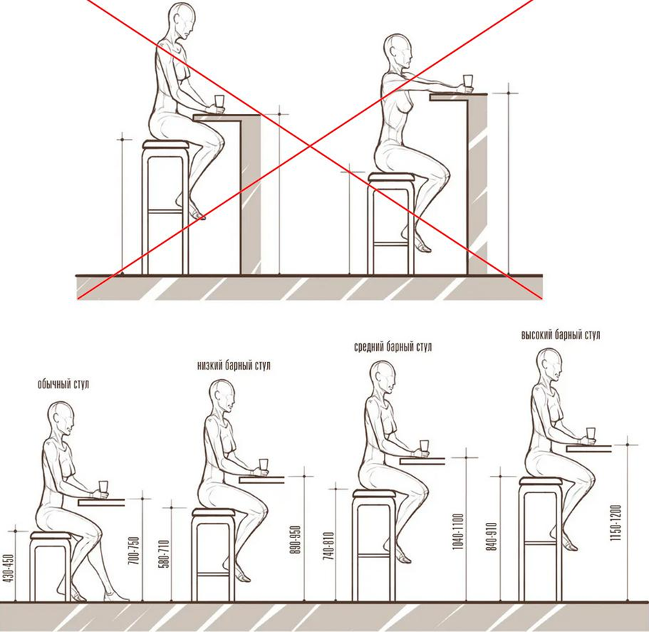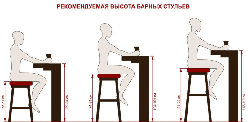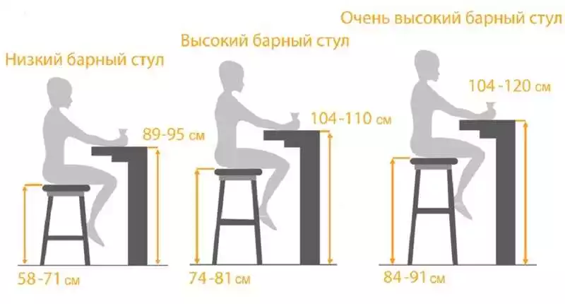 Всем понятно, что барная конструкция должна быть дополнена стульями соответствующих размеров. Высота барного стула и другие параметры определяются принципами эргономики, высотой столешницы над полом, а также обязательным условием – разница между высотой стульев и высотой стойки не должна быть менее 30 см.