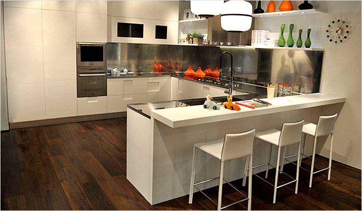 Хорошо, если стойка устанавливается под углом к основной рабочей зоне. В длинной вытянутой кухне это поможет сбалансировать форму помещении, приблизив ее к желаемому квадрату.