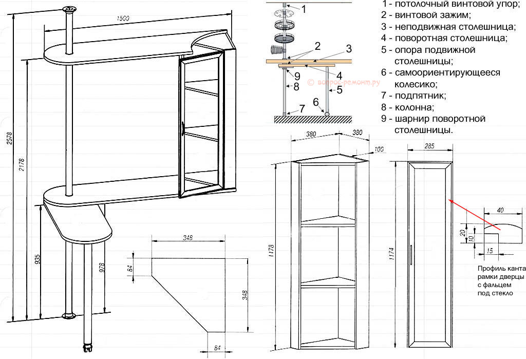 Дизайн и цвет изделия может быть разнообразным и зависит только от предпочтений хозяина. Высота подобных конструкций, как правило, совпадает с высотой кухонной мебели. Часто в них встраивают бытовую технику — духовку, микроволновку, СВЧ-печь.