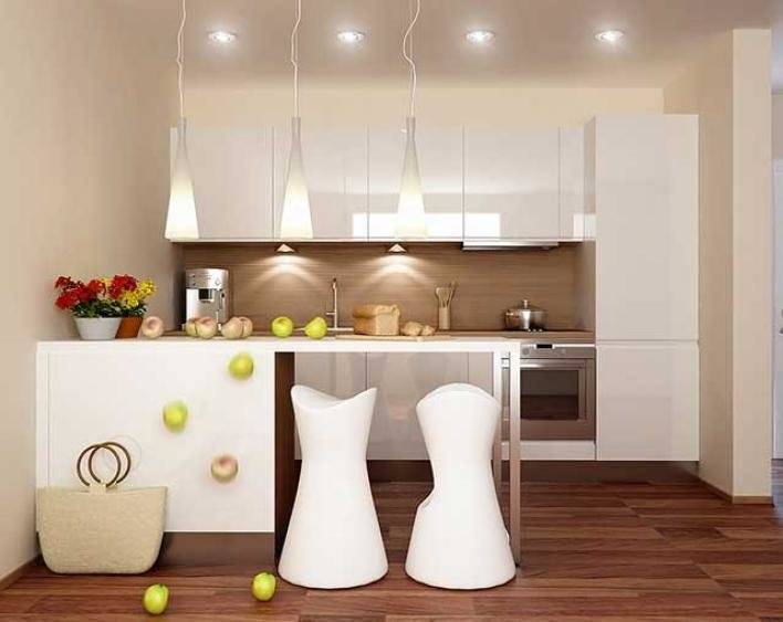 Барная стойка может быть расположена возле стены, между кухней и смежной комнатой или между кухней и пространством балкона.