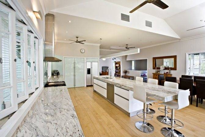 Островной вид подходит только для просторных помещений. Его можно устанавливать в частном доме или в совмещенной с гостиной кухне