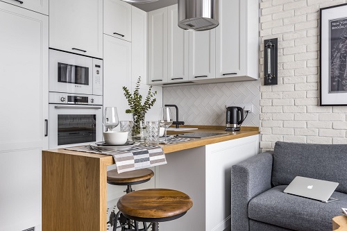 В современных квартирах популярно объединять кухню с гостиной. Здесь стойку можно расположить на границе этих помещений. Она выполнит функцию зонирования пространства и будет прекрасно смотреться как со стороны кухни, так и гостиной.