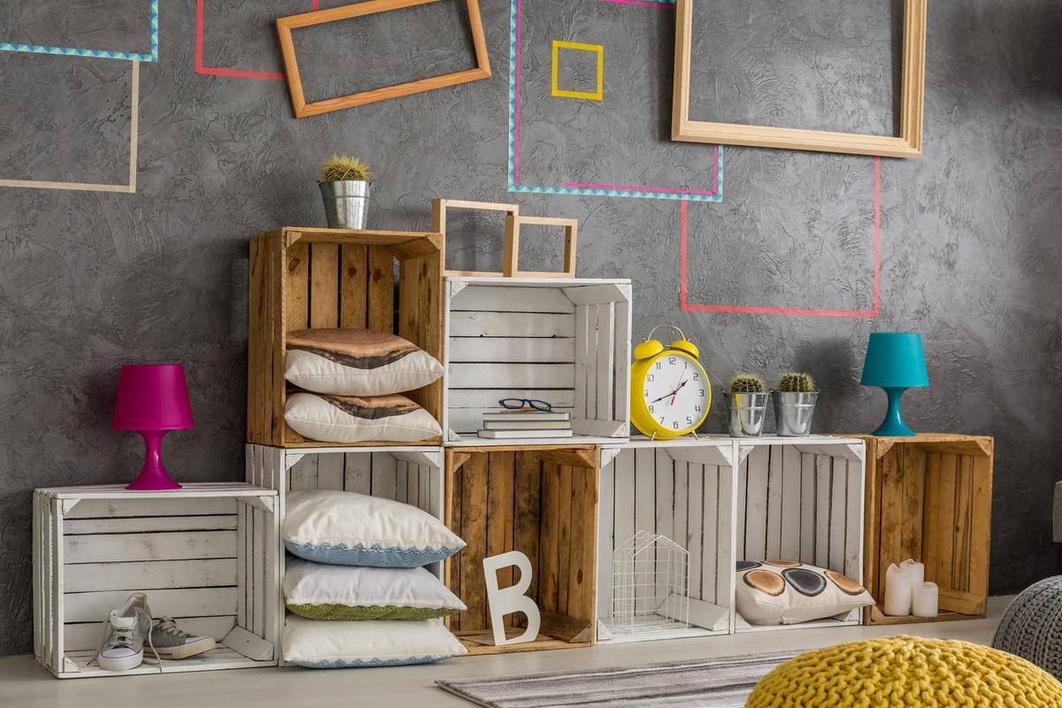 Стеллаж из деревянных ящиков довольно часто используется в качестве перегородки. За счет этого можно сделать зонирование комнаты и визуально расставить акценты.