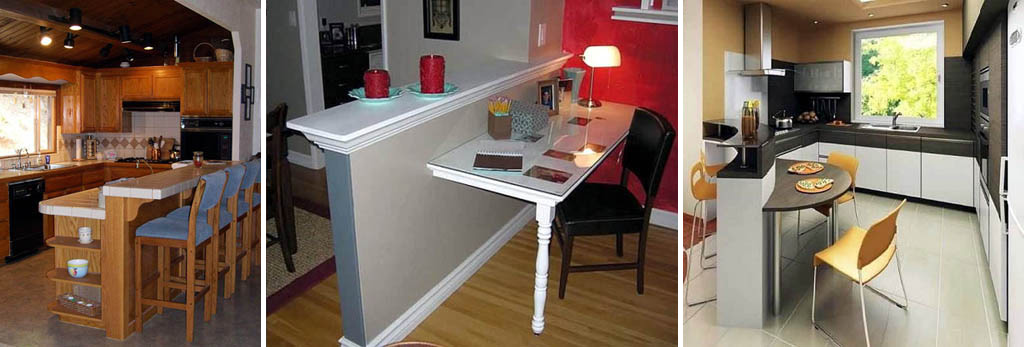 - Барный стол, который крепится торцом стене – лучший вариант для маленьких кухонь. Его высота обычно составляет 75 см, поэтому к нему подойдут обычные стандартные стулья.