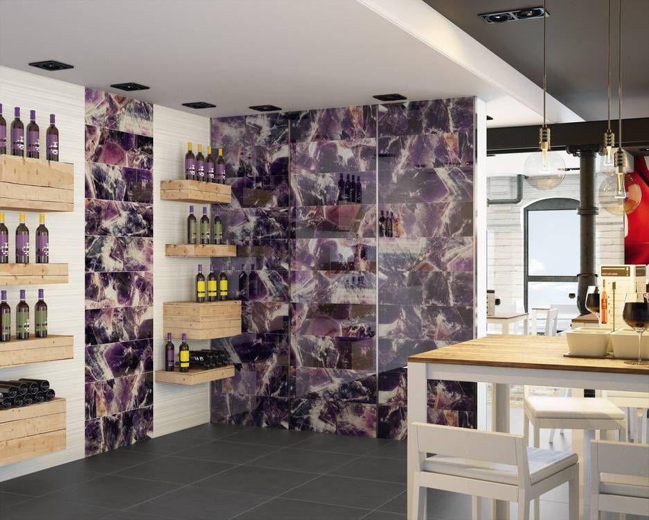 Глянцевая стеклянная плитка обладает интересным зеркальным эффектом и способна создать дополнительный рисунок за счет игры света