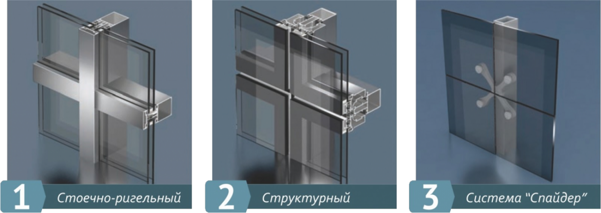 Имеют достаточно много систем строения, однако чаще всего применяется стоечно-ригельная система, так как она считается наиболее простой и надежной. Конструкция имеет вертикальные стойки, к ним прикрепляются горизонтально расположенные ригели, которые несут основную нагрузку. Особенностью конструкции является то, что каркас находится внутри здания. С внешней стороны он кажется полностью стеклянным.