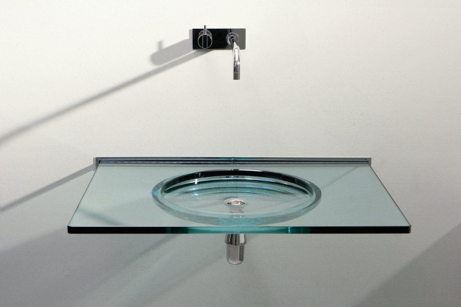 Стеклянный умывальник для ванной может монтироваться к стене или к полу, быть встраиваемым или накладным, слитным со столешницей или подбираться вместе с подстольем, смесителем, зеркалом и опорой