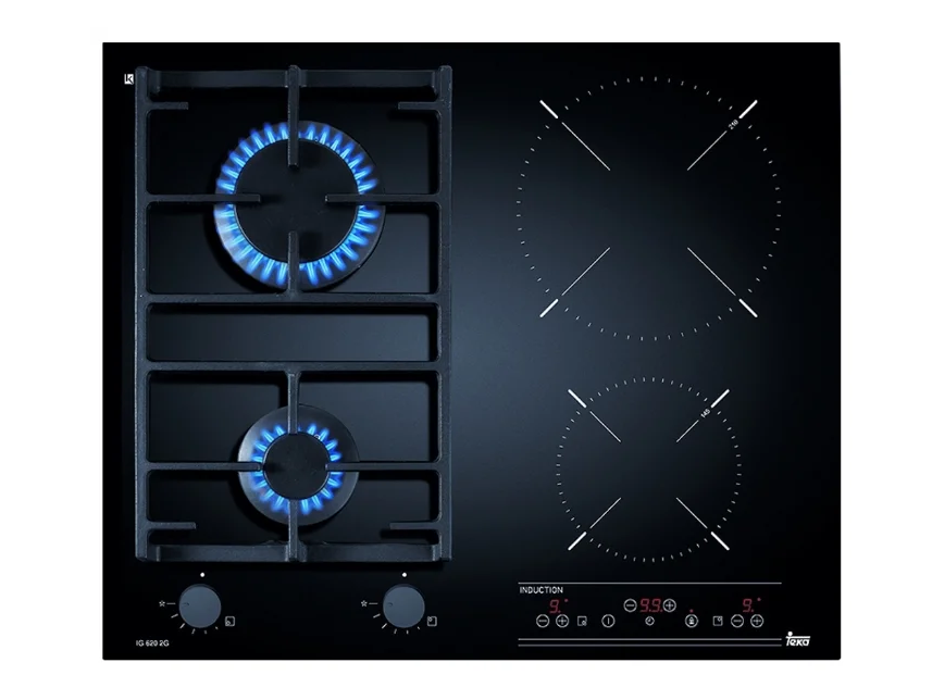 Четырехконфорочная варочная панель имеет две индукционных зоны нагрева с сенсорным управлением и две газовые горелки разного диаметра, управляемые поворотными переключателями. Это одна из лучших варочных поверхностей в своем классе – она доступна по стоимости, отличается современным дизайном и интуитивно понятным управлением. Ее сильные стороны – хорошее качество материалов и комплектующих, а также богатый функционал – индукционные зоны автоматически расширяются и подстраиваются под размер посуды, имеют индикацию остаточного тепла, детектор наличия посуды и прочие привычные возможности. Газовая зона оснащена защитой газ-контроль, автоподжигом, чугунная решетка идет в комплекте.