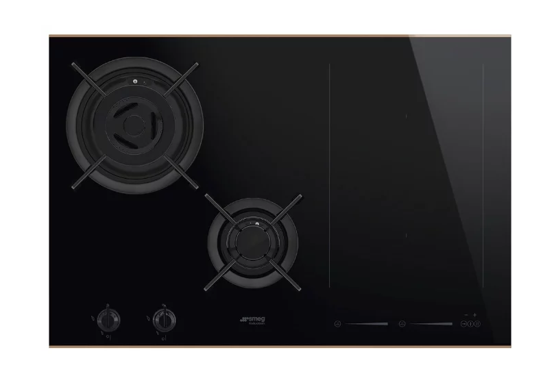 Технологичная и современная комбинированная панель с газовыми и индукционными конфорками эстетично сочетает оба типа нагрева. С одной стороны, размещены две газовые горелки (Крона и обычная), с другой – зона индукции, которая трансформируется в две конфорки (Multizone и Booster) или в одну овальную зону нагрева. Благодаря такой системе панель обладает небольшими габаритами. Управление тоже комбинированное – поворотные ручки для регулировки подачи газа, сенсорные кнопки и слайдеры для индукции. Функциональность соответствует премиальному классу модели – пауза, поддержание кипячения или нагрева, плавление/готовка при низкой температуре, газ-контроль, электроподжиг, таймер, индикатор остаточного тепла или времени. Легче перечислить, чего здесь нет, потому что Smeg – лучшая индукционная панель профессионального уровня.