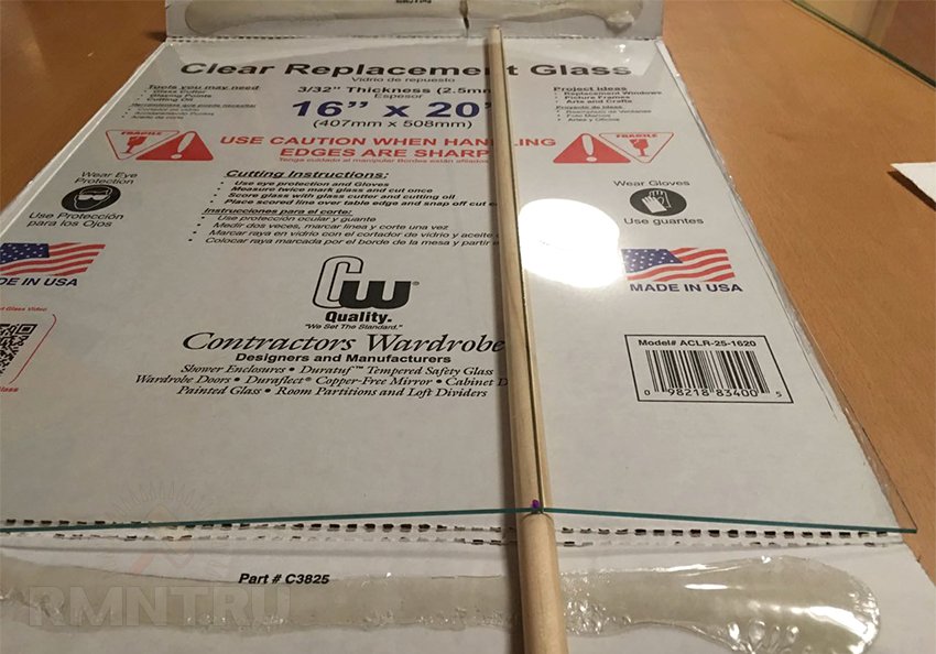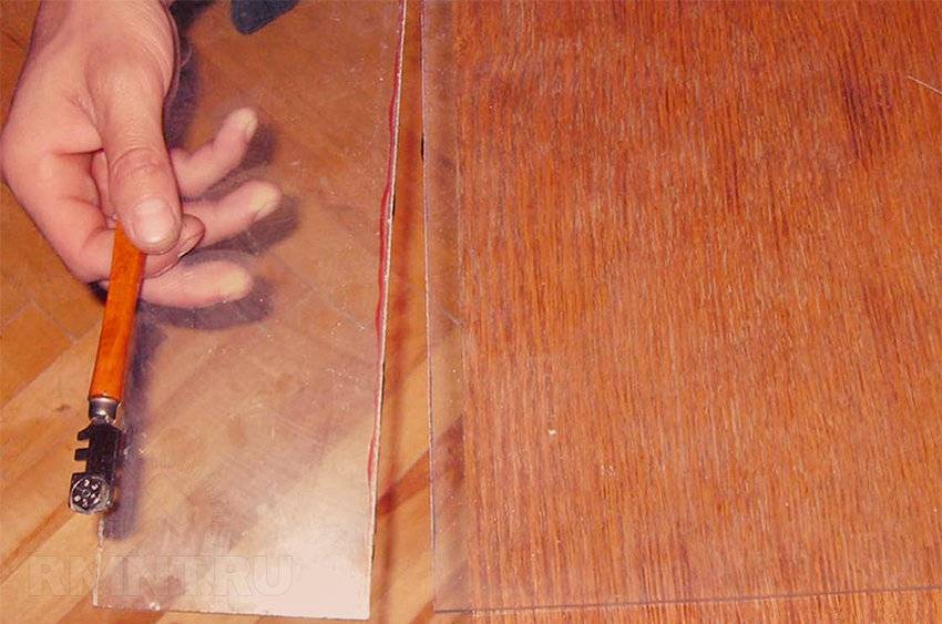 На поверхность рабочего стола, укладывается чистое и сухое стекло. Маркером делается необходимая разметка. Далее на обоих концах, по размеченной линии проделываются небольшие разрезы. Учтите, что используемый материал должен плотно соприкасаться с поверхностью рабочего стола.