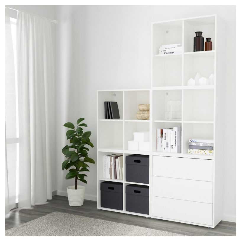 Минимальное оснащение – это секции, открытые с обеих сторон. По-простому: рама без передних дверей, задняя стенка. Все остальные опции можно приобрести отдельно. Иногда в комплект входит 2, 4, 8, 10 вкладышей. Икеа в основном предлагает четное число, стандартное расположение внизу, по центру. При необходимости измените.
