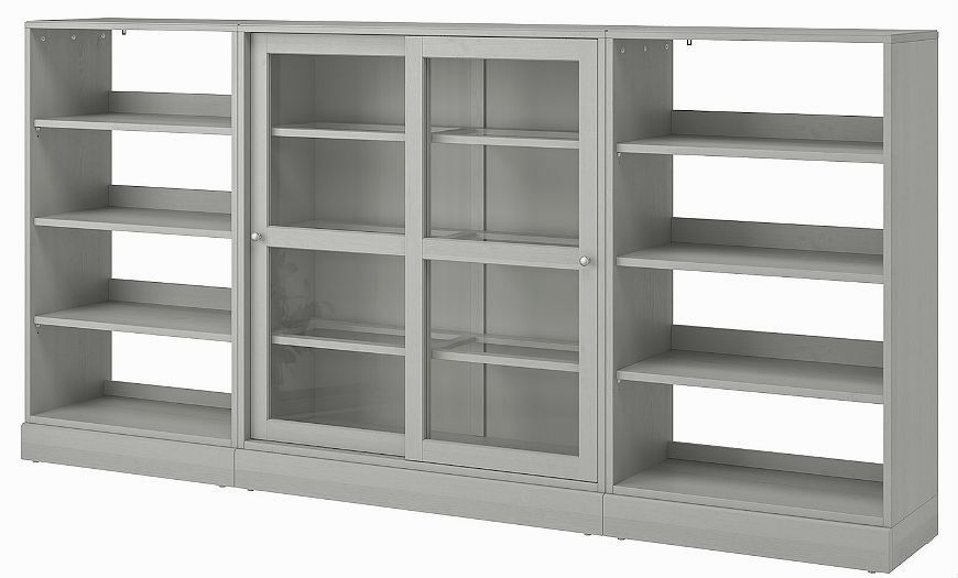 Открытые модули с длинными полками применяют для хранения книг. Стеллаж можно поставить на шкаф серии «Хавста». В напольном варианте установки используют цокольный элемент соответствующего размера.