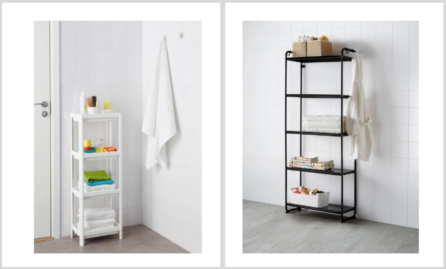 На металлических стойках устанавливают решетчатые полки либо корзины. Такая система подходит для помещений с высоким уровнем влажности. Нейтральный внешний вид гармонирует с разными дизайнерскими решениями.