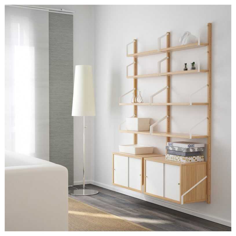 Самая скандинавская серия из всех имеющихся. Предметы «Свальнэс» изготавливаются из бамбука, а дополняет его белый металл. В ассортименте не только полки и стеллажи, но целые панели, включающие столешницу для создания уютного рабочего места и ящики для хранения. Модули можно комбинировать между собой.