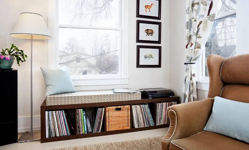 Стеллаж Каллакс ИКЕА в интерьере может выполнять функции других предметов мебели, если правильно его расположить. Например, соединив вместе несколько ящиков и накрыв их столешницей, можно создать интересный столик.