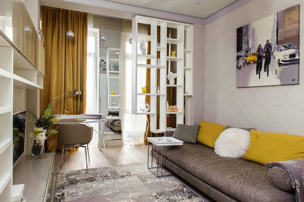 Фальшстены, стационарные или раздвижные конструкции из стекла, гипсокартона, пластика или дерева, арочные модели, этажерки с комнатными растениями и многое другое, предоставляет прекрасную возможность наиболее эффективно и функционально распорядиться площадью гостиной.