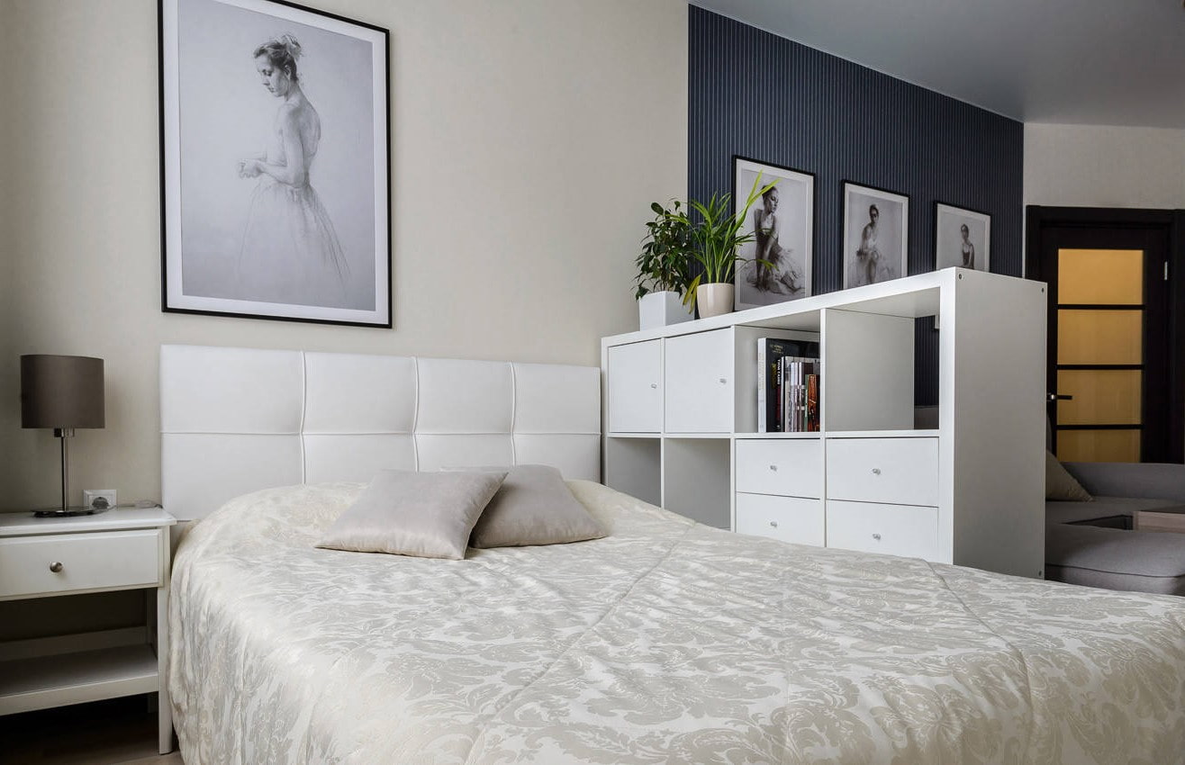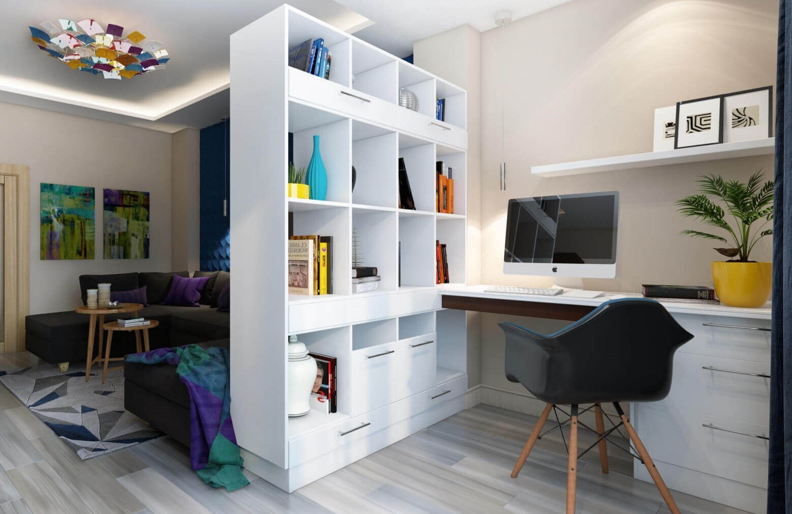 На фото белый стеллаж-перегородка из ДСП, отделяющий спальное место от гостиной.