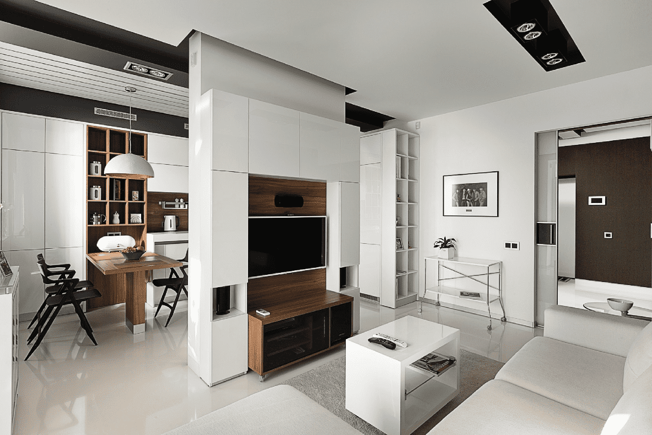 • Телевизор. Телевизионный экран прямоугольной формы, расположенный в центре стеллажа-перегородки, гармонично впишется в общую геометрическую композицию и будет прекрасно сочетаться с другими элементами декора.