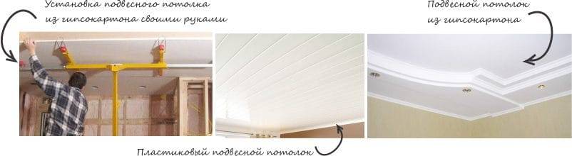 Подвесной потолок, основным материалом которого являются или влагостойкий гипсокартон. Пластик не боится капель жира, пара и влаги, а уход за ним практически не требуется. Гипсокартон так же хорош, позволяет создавать даже многоуровневые конструкции, но он требует побелки, которую периодически нужно обновлять. Общий недостаток таких потолков — отступ десятка сантиметров от чернового потолка