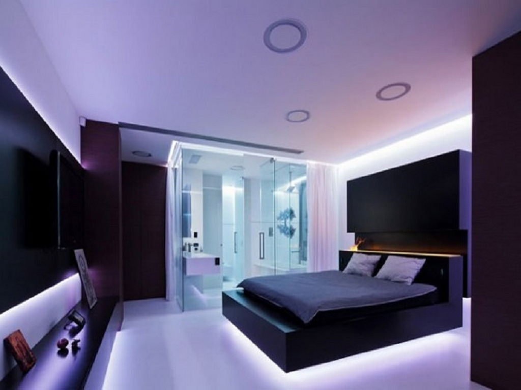 - Многоуровневое освещение. Света в спальной комнате должно быть очень много. Причем используется в основном искусственное освещение, а наличие окон не столь значимо. Эффектно в хай теке смотрятся точечные светильники, которые отражаются в металлических и стеклянных поверхностях. Приветствуется использование декоративной подсветки холодных, неоновых тонов: изумрудный, синий, фиолетовый;