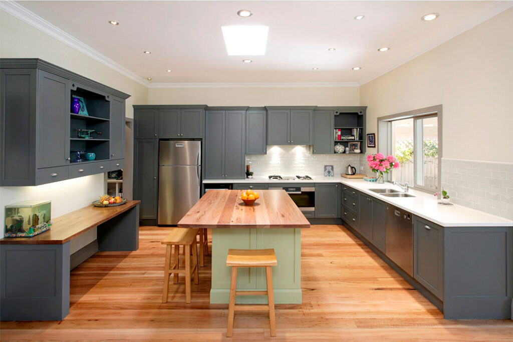 Приветствуется встроенная техника, закрытая глухими фасадами кухонного гарнитура;