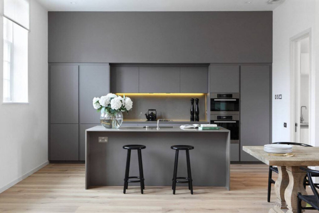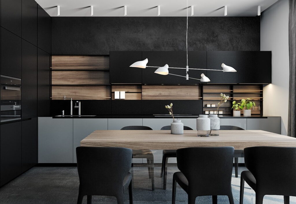 В таких моделях практически никогда не бывает стеклянных фасадов и открытых полок. Что касается формы, самыми распространенными стали гарнитуры в стиле минимализм в форме буквы «П» и «Г» либо в виде прямой линии.