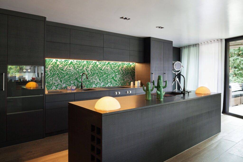 Эффектно разбавить монохромный дизайн можно с помощью яркого фартука из закаленного стекла или плитки. Стильно смотрится гарнитур, фартук и столешница которого выполнены из одного и того же материала, имеющие одинаковый оттенок и текстуру, например из искусственного камня.