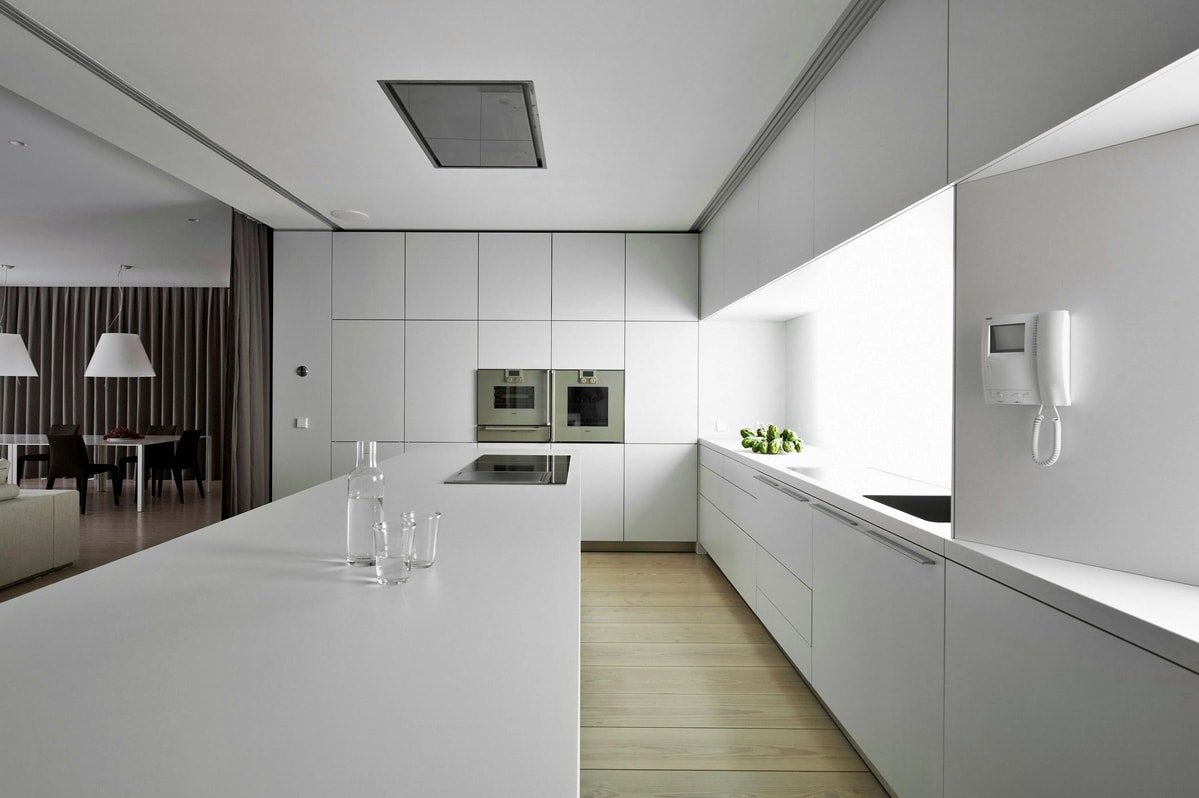 Как правило, минимализм призывает скрывать все бытовые приборы за кухонными фасадами. Это наиболее предпочтительный вариант, но он подходит далеко не всем, ведь для подключения необходимо наличие технических возможностей и свободного места в помещении.