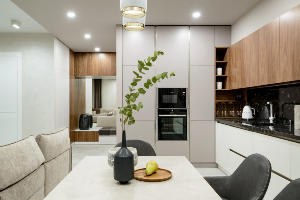 Идеальный вариант – встроенные бытовые приборы. Это касается и микроволновки с кофеваркой. Мелкую технику вроде блендера, кухонного комбайна, соковыжималки или мультиварки лучше убрать в ящик или шкаф. Поверхность столешницы должна быть, по возможности, свободной от лишних предметов.