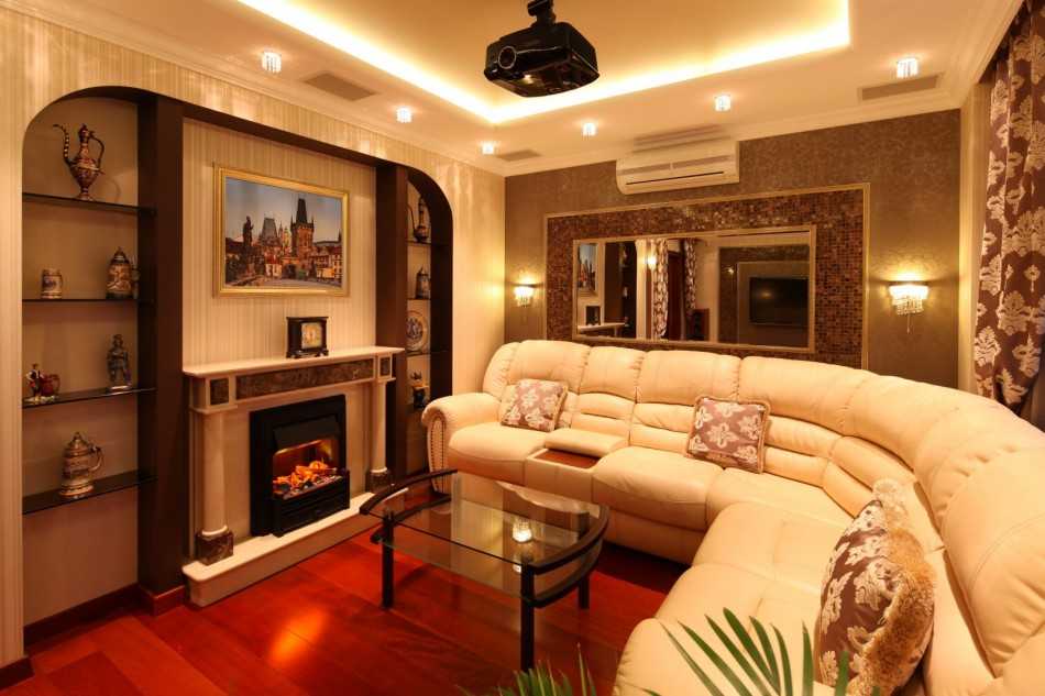 Практичные угловые диваны располагают в центре гостиной. Рядом с зоной отдыха обычно ставят тяжелый стол с низкой столешницей. Горки, трюмо, тумбы под телевизор могут иметь нестандартную асимметричную форму.