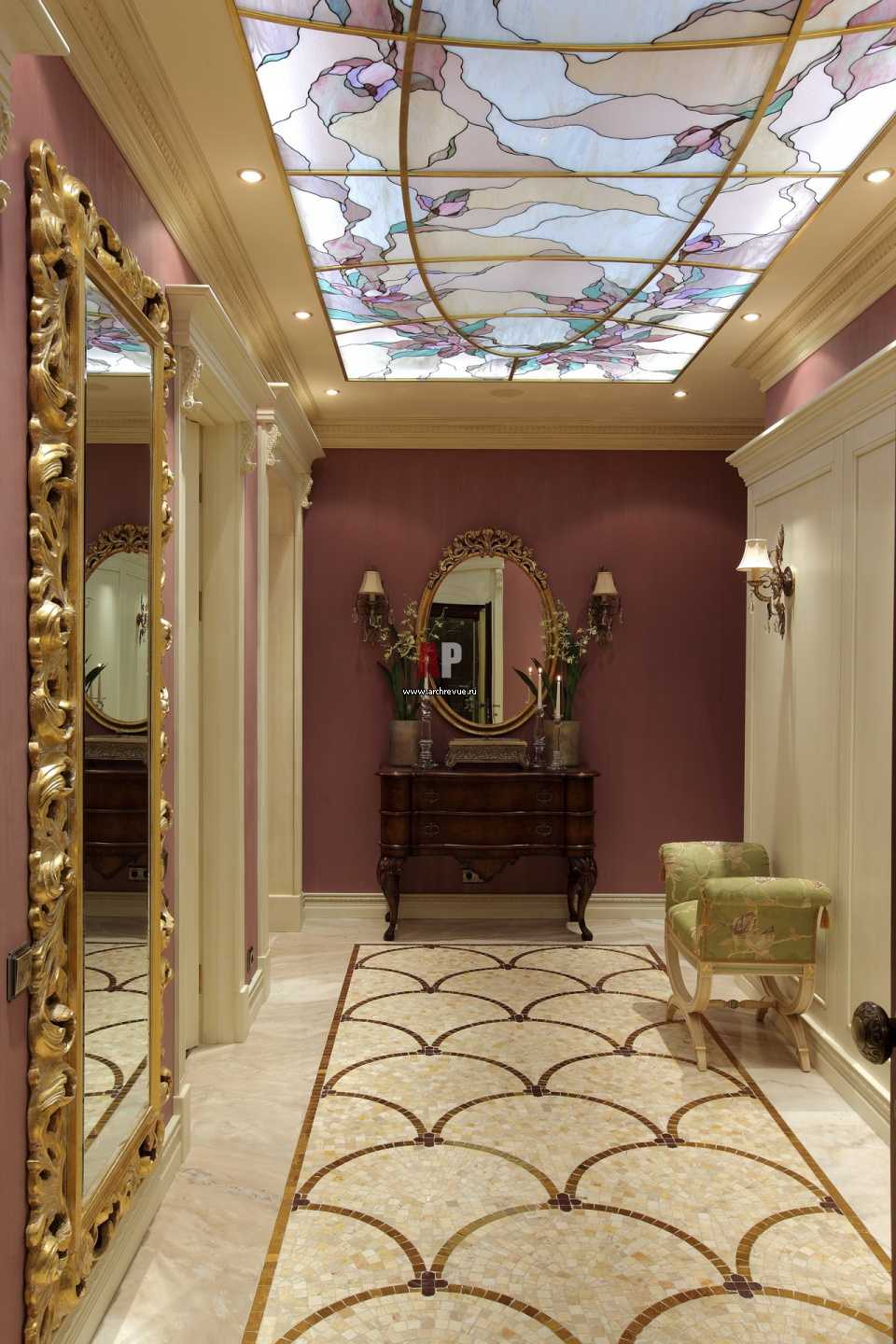 Приемлемо использование дополнительных аксессуаров. Потолок можно украсить лепниной. Прекрасно впишется в общий интерьер напольная ваза для цветов.