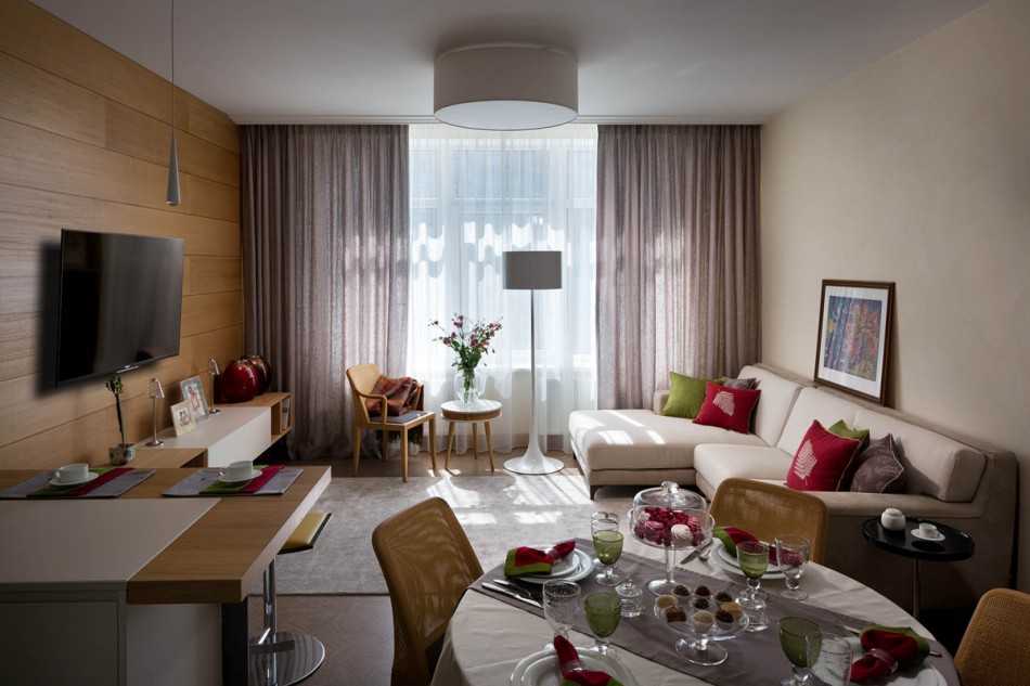 Мебель должна быть выдержана в одном стиле. Диванную зону можно расположить в центре комнаты буквой «п» или «г», со столом посередине. Крупная люстра в центре комнаты и аксессуары в стиле модерн завершат оформление гостиной.