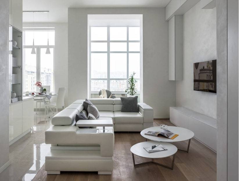 Не менее важно избегать перегрузки деталями и яркими красками. Это касается и дизайна поверхностей, и мебели гостиной. Проходные залы можно сделать совмещенными с кухней или балконом