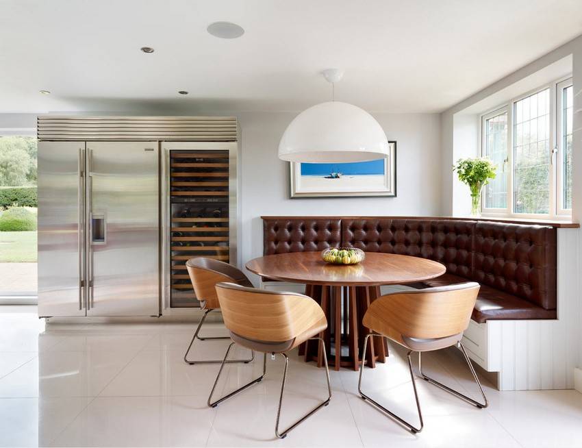 К столу подберите стулья с каркасом, изготовленным на основе металла и пластика, обитые цветным заменителем кожи. В такой интерьер впишутся почти все современные виды стульев: их легко превратить в пестрый акцент в помещении.