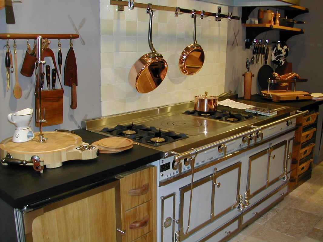 В частном доме кухня может быть оформлена более аутентично, для этого в рабочей области можно разместить оригинальную кухонную плиту. Она может использоваться не только для приготовления пищи, но и стать центром эстетического пространства.