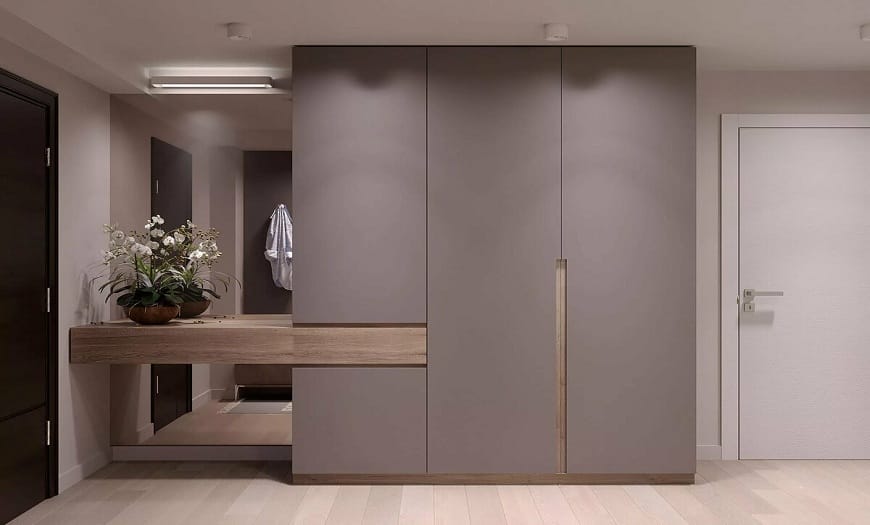 Выбор предметов и планировка полностью зависят от метража. В небольшую прихожую в современном стиле можно подобрать шкаф-купе. Это лучше, чем открытые полки или крючки, поскольку одежда визуально не будет захламлять пространство. Можно оставить пару крючков над тумбой для обуви или скамейкой. Их могут использовать гости.