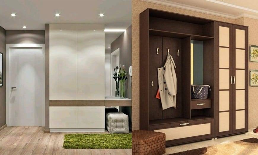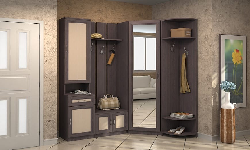 Прихожая – комната, где размещается значительная часть одежды. Прежде чем выбирать мебель, оцените размеры гардероба. Если одежды немного, то подойдет небольшой шкаф-купе или угловой шкаф.