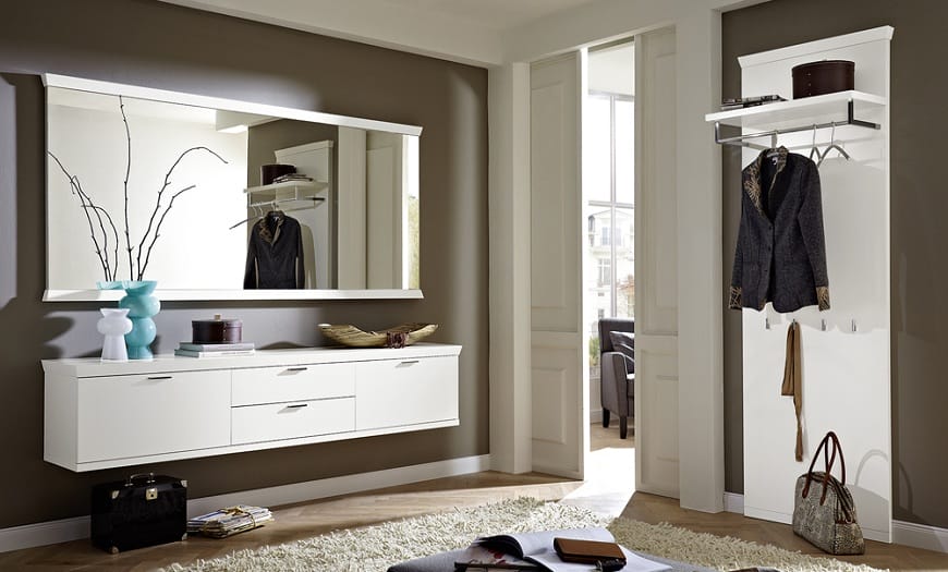 Например, можно приобрести тумбочку для мелочей, вешалку для одежды и подставку для обуви. Расставлять эти элементы мебели нужно с учетом размеров и формы помещения.