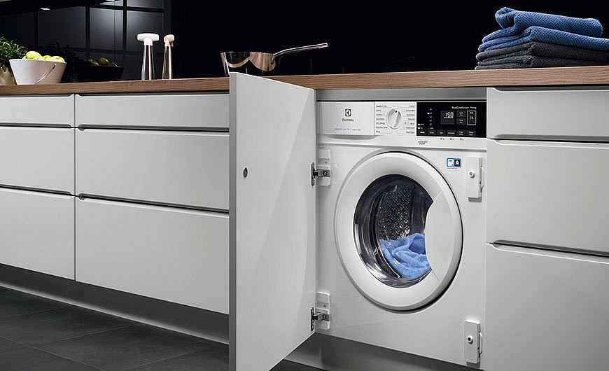 Если свободного места на кухне достаточно, можно встроить конструкцию с горизонтальной загрузкой белья. Встроенная модель устанавливается под столешницу. Если в этом случае будут возникать сложности с открытием емкости для порошка, его можно сразу засыпать в барабан. На процесс стирки это не повлияет, но пользоваться машинкой будет удобнее.