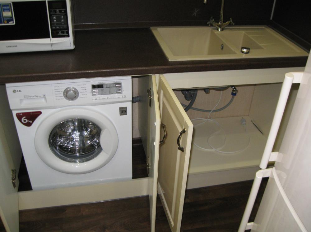 Машинку стандартных размеров установить не получится, она не вместится. Выбирать следует компактную модель глубиной 45-50 см. При таком расположении следят, чтобы лоток для стирального порошка выдвигался. Желательно, чтобы дверь гарнитура и люк стиралки можно было открыть в одну сторону, иначе неудобно загружать и вынимать вещи. Для предотвращения шума при стирке с каждой стороны необходим запас в 2-3 см. Чтобы не допустить появления лишней сырости, у гарнитура рекомендуется снять заднюю панель. Так обеспечивается циркуляция воздуха.