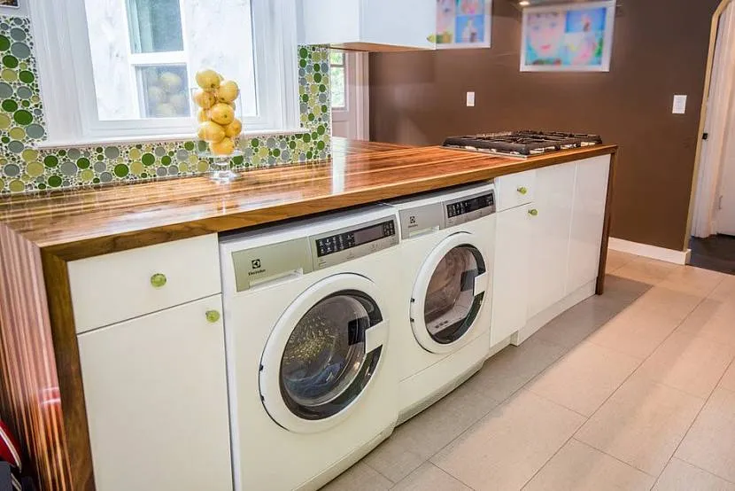 Интересный вариант – установка стиральной машины на кухне под столешницей без дверцы. Ее ставят рядом с гарнитуром, накрывают сверху столешницей, которую прикрепляют к стенке. Сбоку аппарат будет видно, а верхняя поверхность станет еще одним рабочим столом кухни. Чтобы технику не было видно, можно закрыть шторкой или украсить виниловой наклейкой. Особенно удобно такое расположение при возникновении неисправности, прибор легко отодвинуть и задвинуть на место.