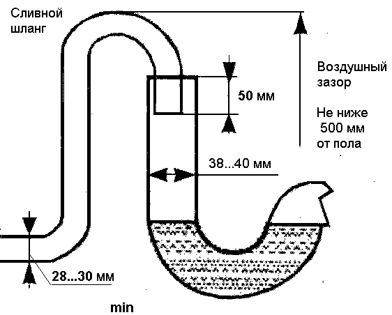 Здесь важно помнить, что перед входом в канализацию сливной шланг должен иметь коленообразный перегиб высотой 45-50 см