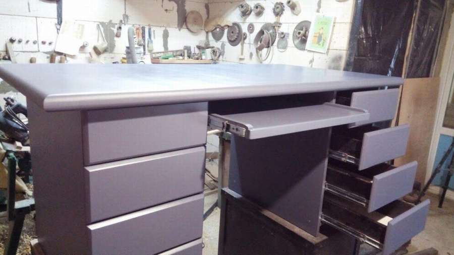 И последнее, чем бы хотелось поделиться с вами — окраска компьютерного стола со стеклянными элементами. Тут все достаточно просто- краска должна наноситься на противоположную сторону лицевой поверхности. Глядя на представленное нами фото можно заметить, что краска нанесена на низ столешницы, а не сверху, что позволило сохранить эффект «Стеклянности» конструкции.