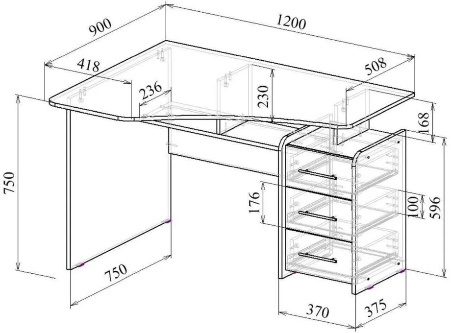 По большому счету, все чертежи компьютерных столов сводятся к трем основным видам и вариациями на их тему: